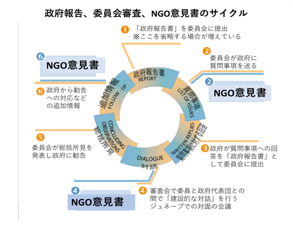 人権条約を批准した国が条約の委員会に定期的に政府報告書を提出し、委員会から審査を受ける仕組みです。委員会と政府代表団との審査会合にNGOとして傍聴参加ができます。委員会にNGO意見書を提出、委員とNGOの会合にも参加、発言もできます。
